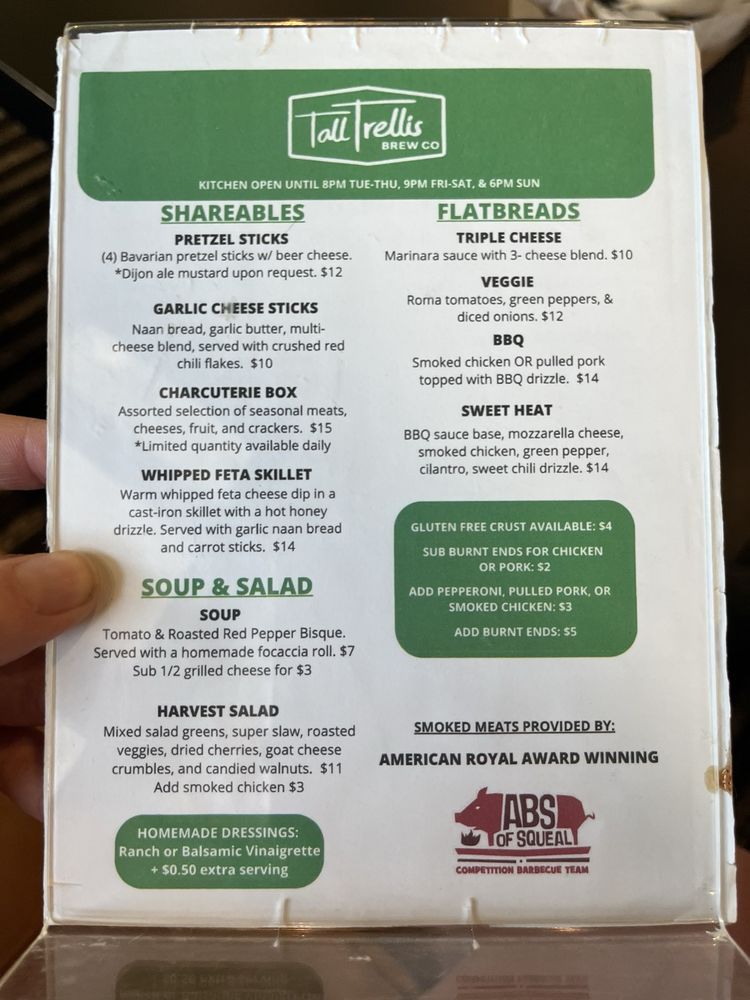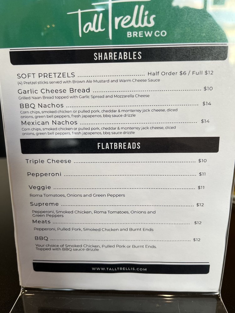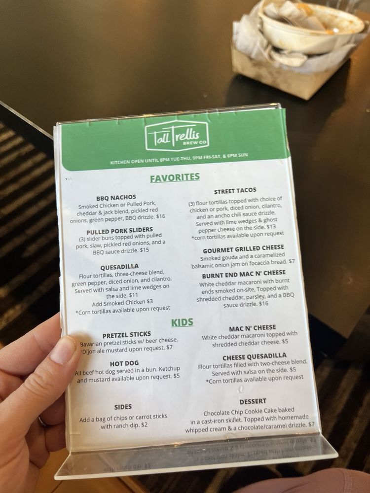 “ Tall Trellis Brew Co. was the perfect spot to stop for a bite while visiting town with my dad and toddler. The outdoor seating area was beautiful and familyfriendly, and the food was fresh, flavorful, and hit the spot. I also appreciated ... ”