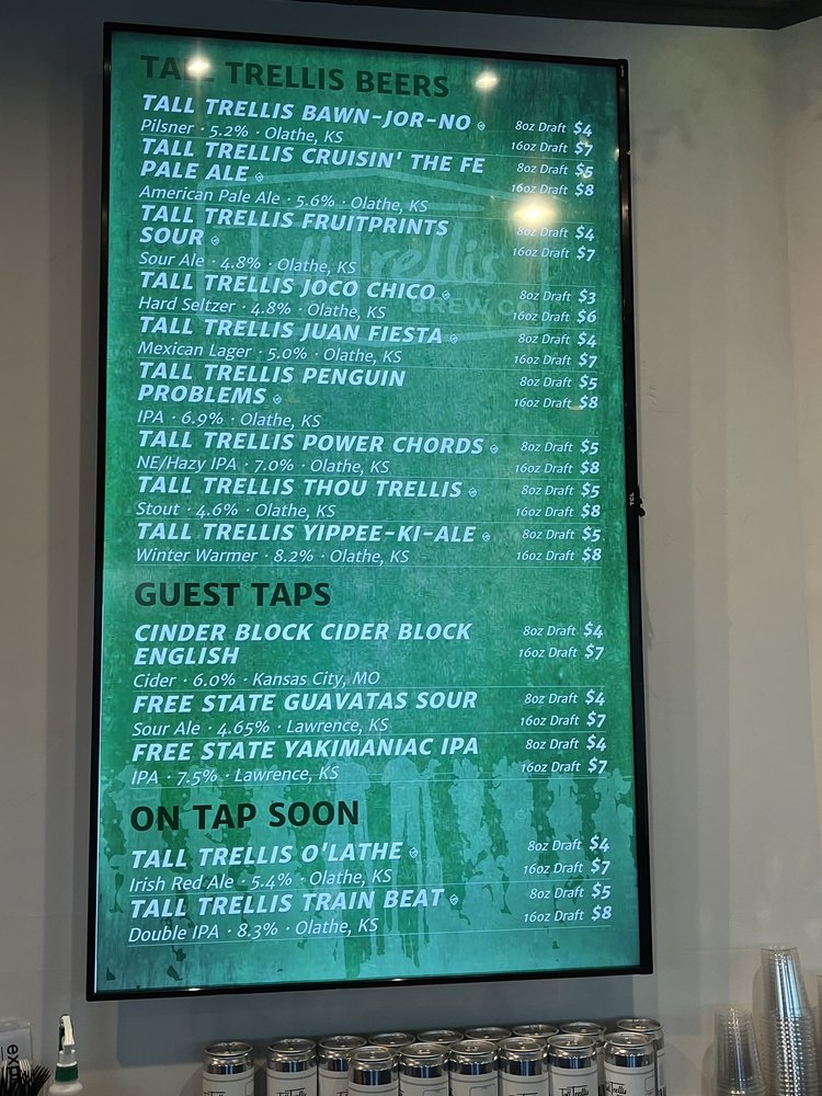 “ What a phenomenal place. No clue how anyone could give anything less than a 5 star review. The items we chose from the menu were delicious. Beer was over the top. Service was fast and friendly. Kids loved Tall Trellis as well. Great time had by all!! Nice work!!! ”