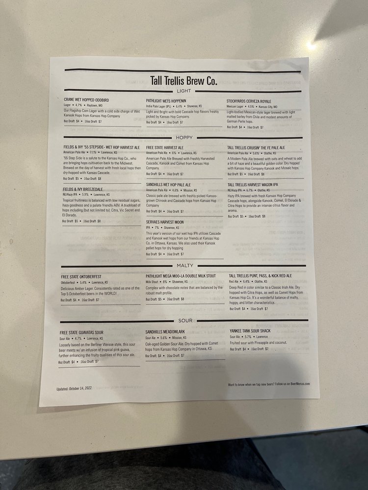 Tall Trellis Brew Co is a vibrant venue offering an array of amenities for its patrons, from outdoor seating and live music to a full bar and catering services. Located in Olathe, KS, this bar provides an inclusive and accessible atmosphere for all guests, with options for takeout, delivery, and outdoor seating. The menu features delicious dishes suitable for all ages, and the cozy ambiance is perfect for gathering with friends or enjoying a solo meal. With ample parking, free Wi-Fi, and a range of payment options, Tall Trellis Brew Co is a must-visit spot for those looking for a memorable dining experience.